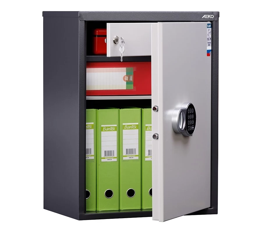 Шкаф Aiko SL-65Т EL – это прочное сварное изделие из стальных листов толщиной 1.2 мм. На дверь устанавливается электронный замок PLS-1 с возможностью аварийного открывания, для чего прилагается мастер-ключ. Для питания требуется четыре батарейки 1.5 В; имеется индикатор, уведомляющий о потере напряжения. В случае разрядки батарей код не меняется.